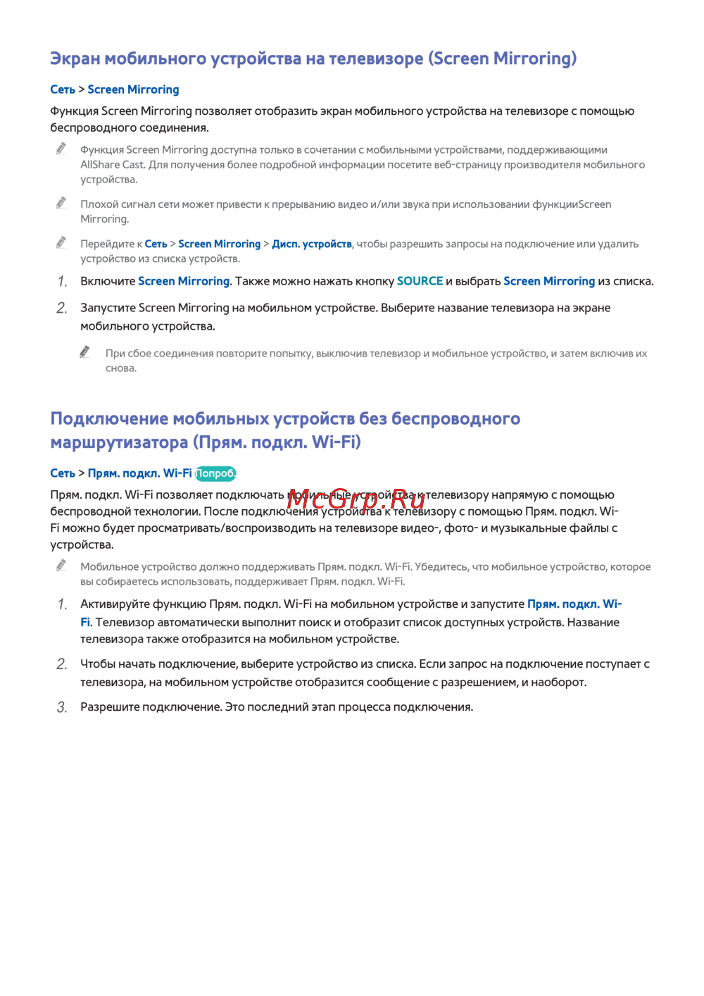 Прям. подкл. Wi-Fi позволяет подключать мобильные устройства к телевизору напрямую с помощью