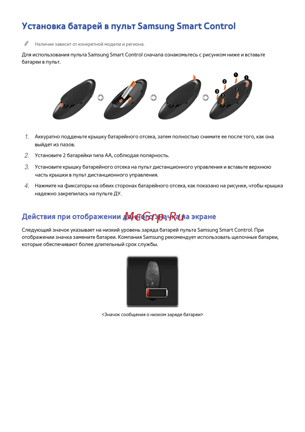 отображении значка замените батареи. Компания Samsung рекомендует использовать щелочные батареи,