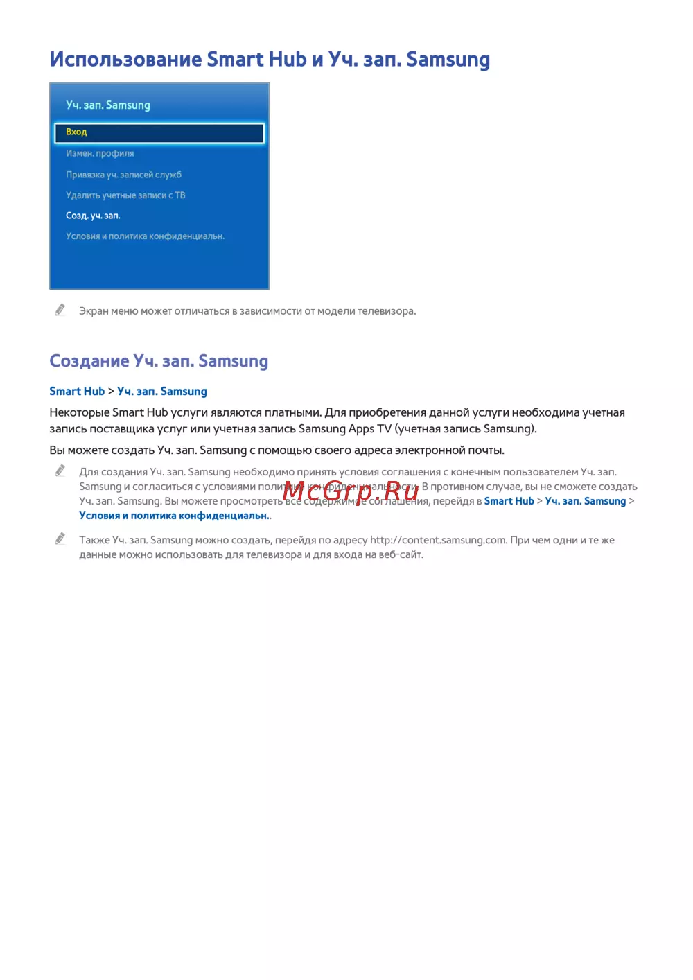 Уч. зап. Samsung. Вы можете просмотреть все содержимое соглашения, перейдя в Smart Hub > Уч. зап. Samsung >