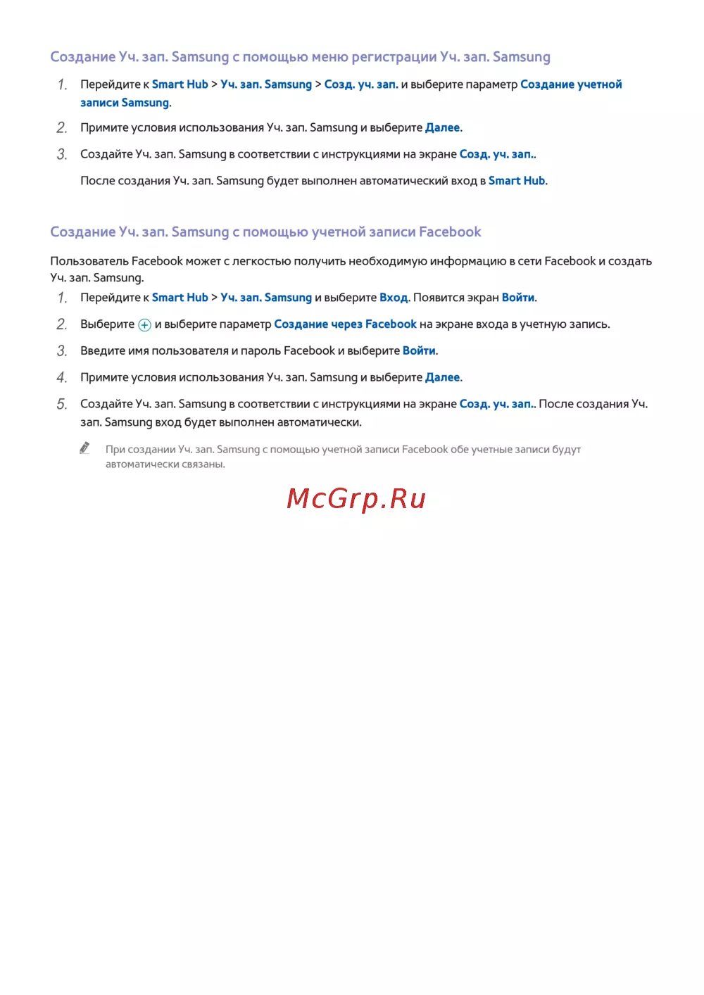 При создании Уч. зап. Samsung с помощью учетной записи Facebook обе учетные записи будут
