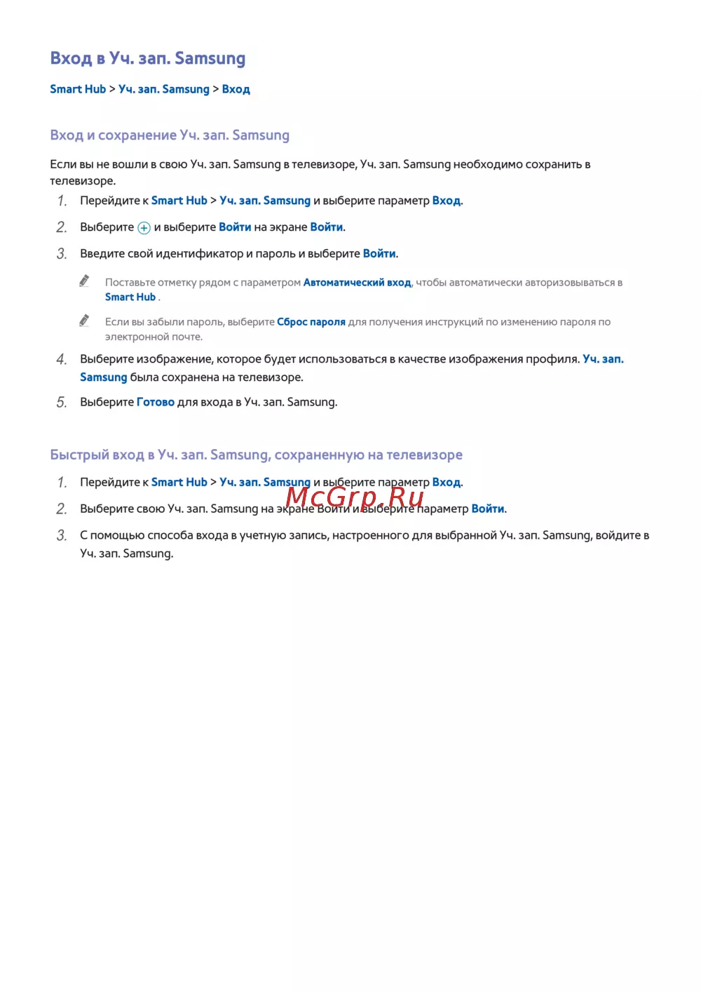 Быстрый вход в Уч. зап. Samsung, сохраненную на телевизоре
