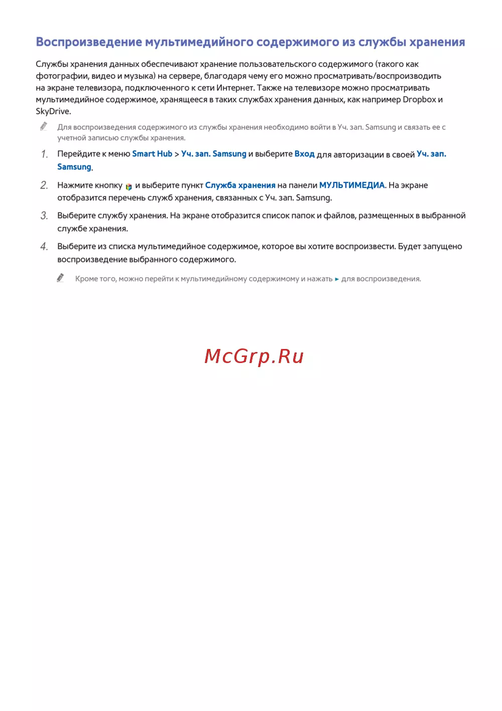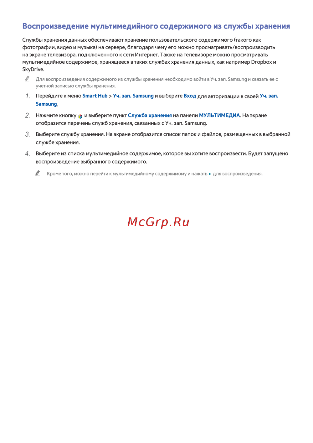 Для воспроизведения содержимого из службы хранения необходимо войти в Уч. зап. Samsung и связать ее с