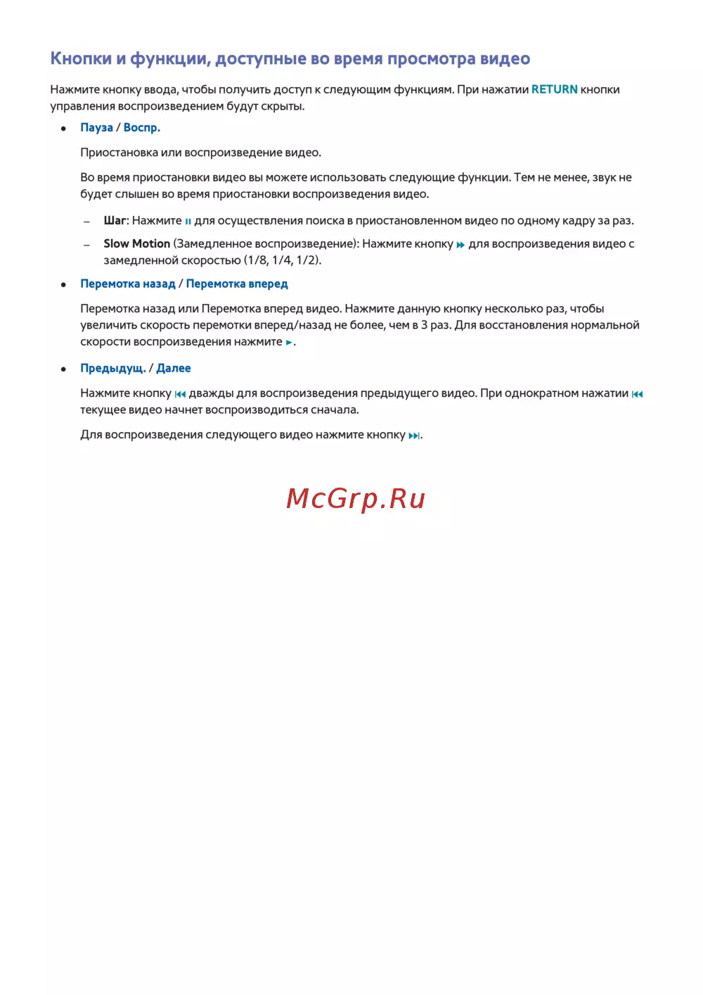 Узнайте о кнопках и функциях, доступных во время просмотра видео. Овладейте управлением воспроизведением, перемоткой и замедленным воспроизведением.