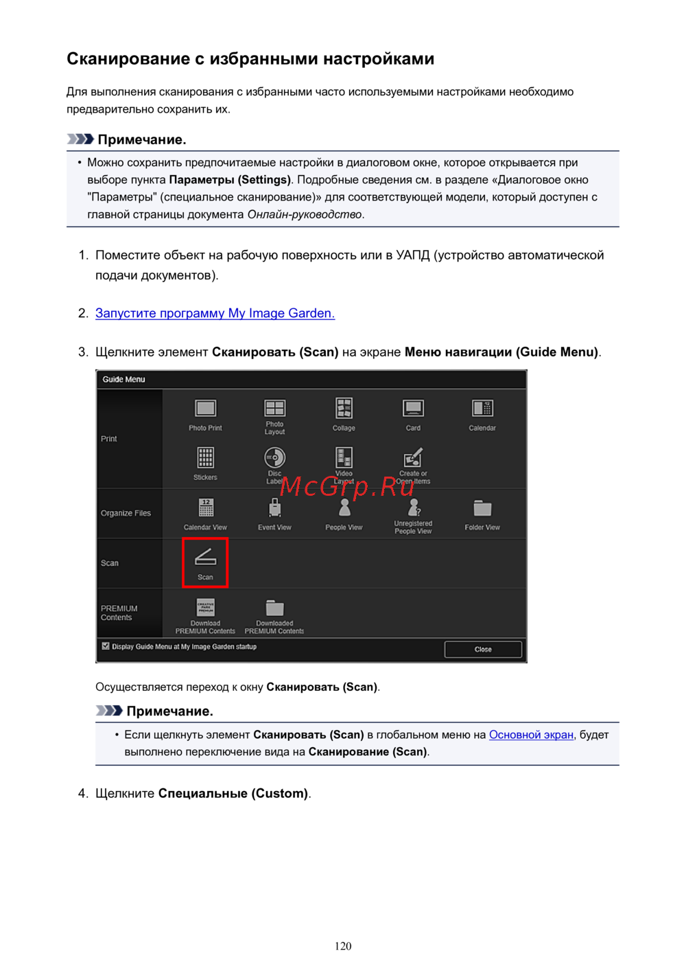 "Параметры" (специальное сканирование)» для соответствующей модели, который доступен с
