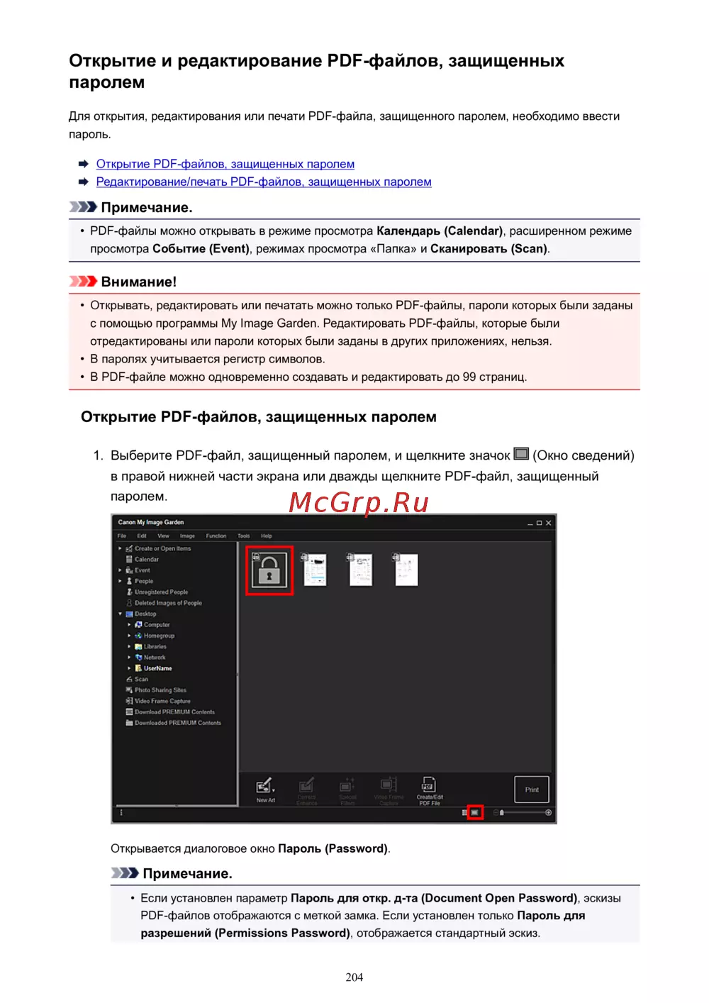 • Открывать, редактировать или печатать можно только PDF-файлы, пароли которых были заданы