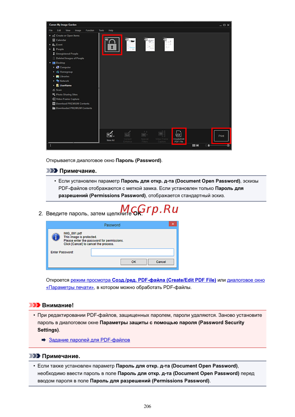 Canon MG4140 [206/337] При редактировании pdf файлов защищенных паролем пароли удаляются заново установите пароль в диалоговом окне параметры защиты с помощью пароля password security settings