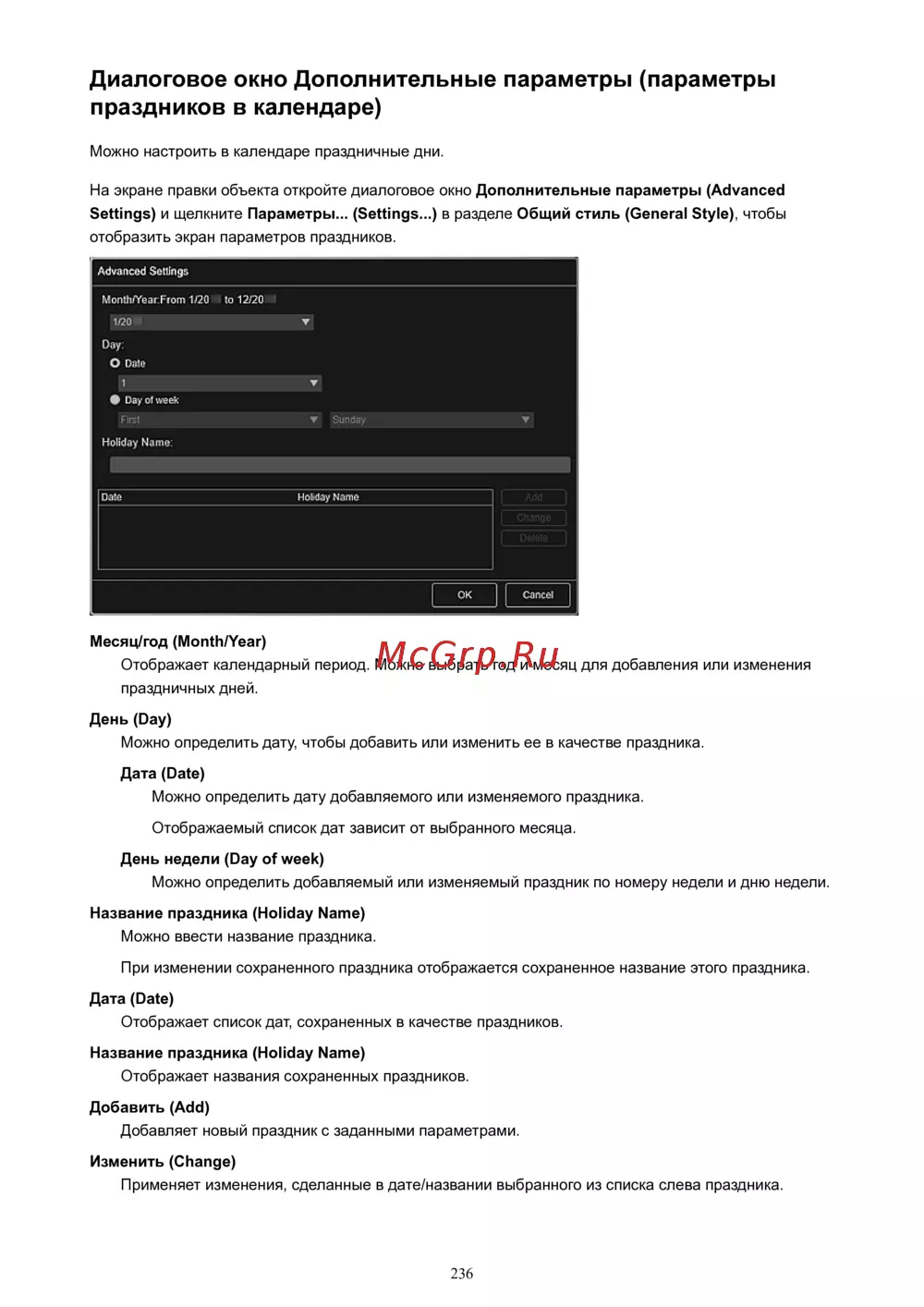 Canon MG4140 [236/337] Диалоговое окно дополнительные параметры параметры праздников в календаре