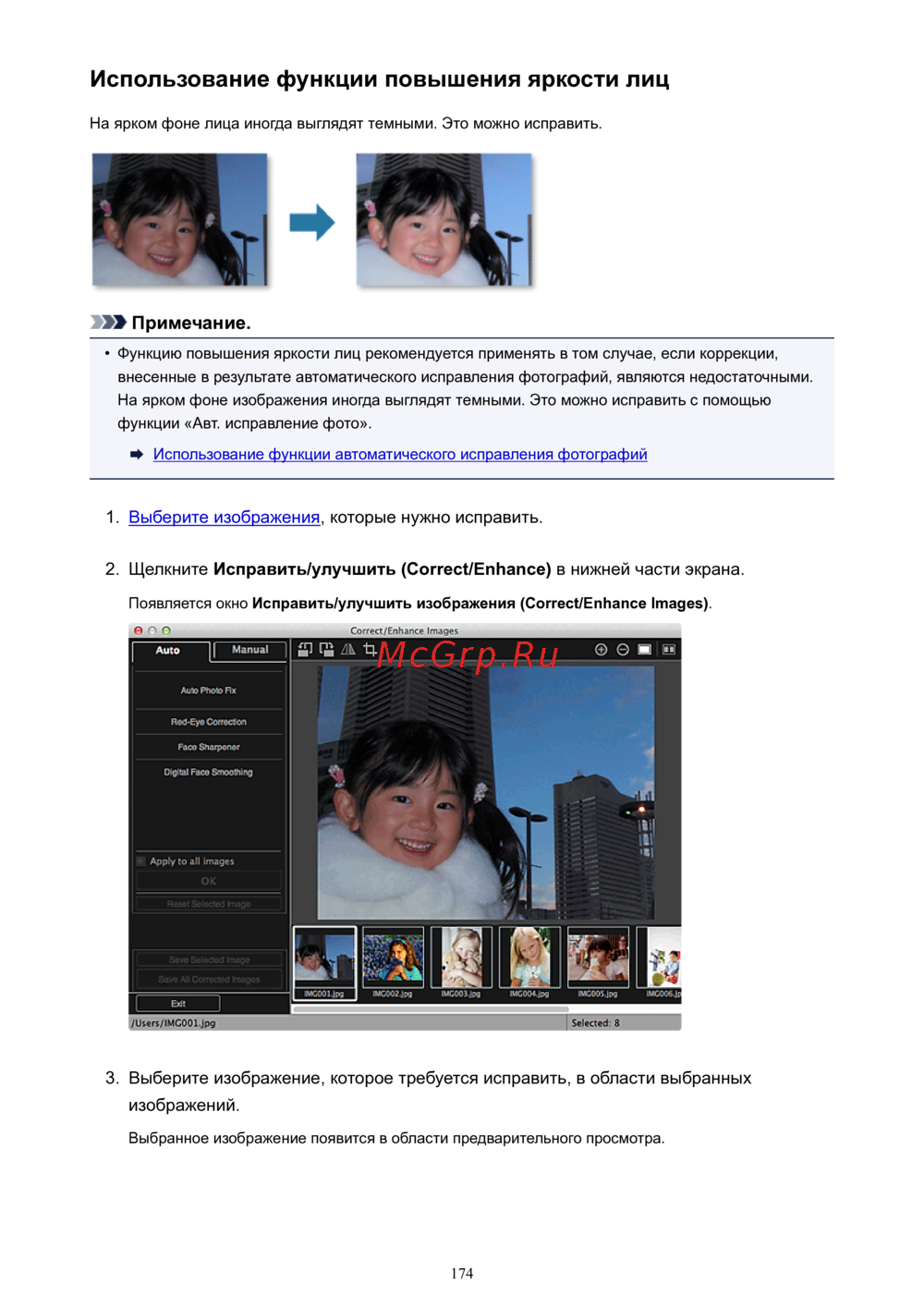 • Функцию повышения яркости лиц рекомендуется применять в том случае, если коррекции,