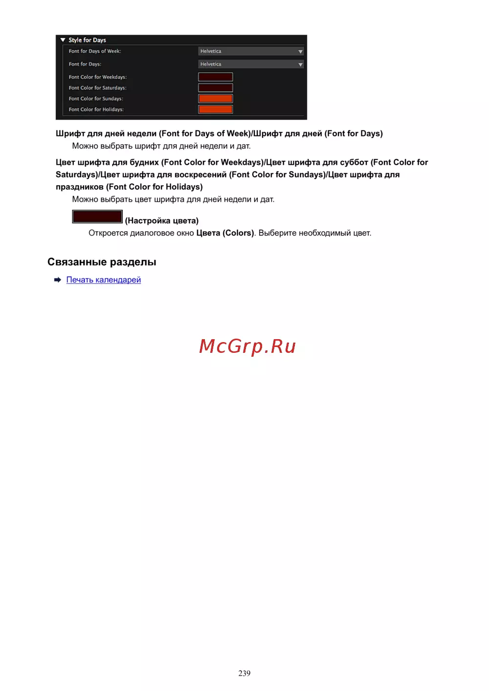 Saturdays)/Цвет шрифта для воскресений (Font Color for Sundays)/Цвет шрифта для