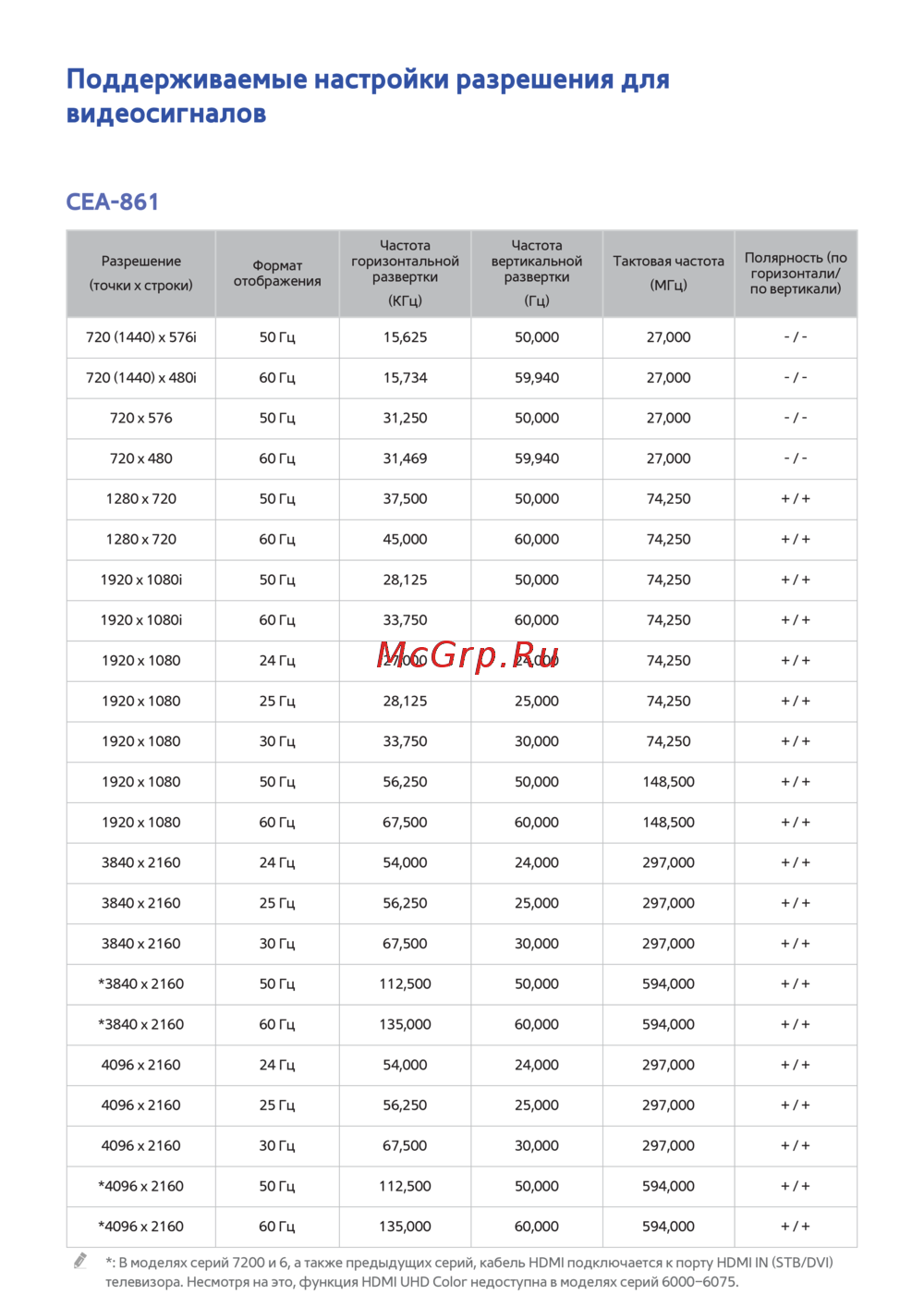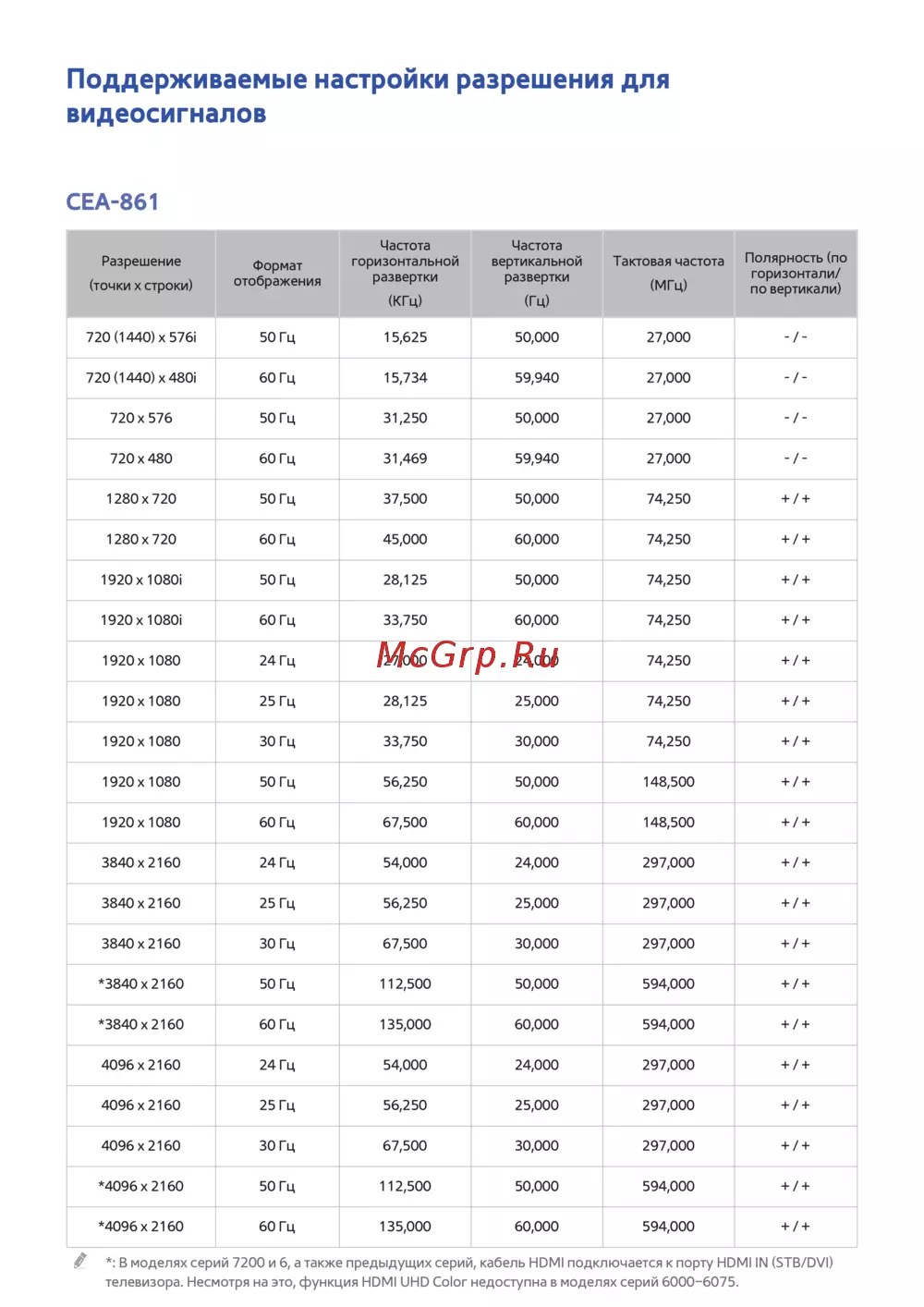 3840 х 2160 24 Гц 54,000 24,000 297,000 + / +