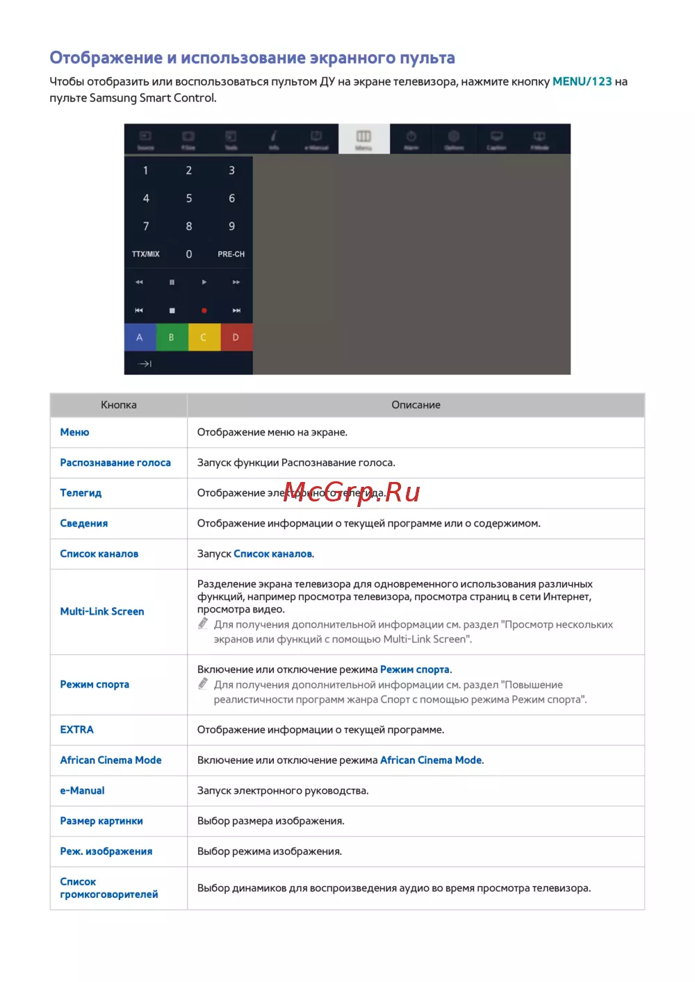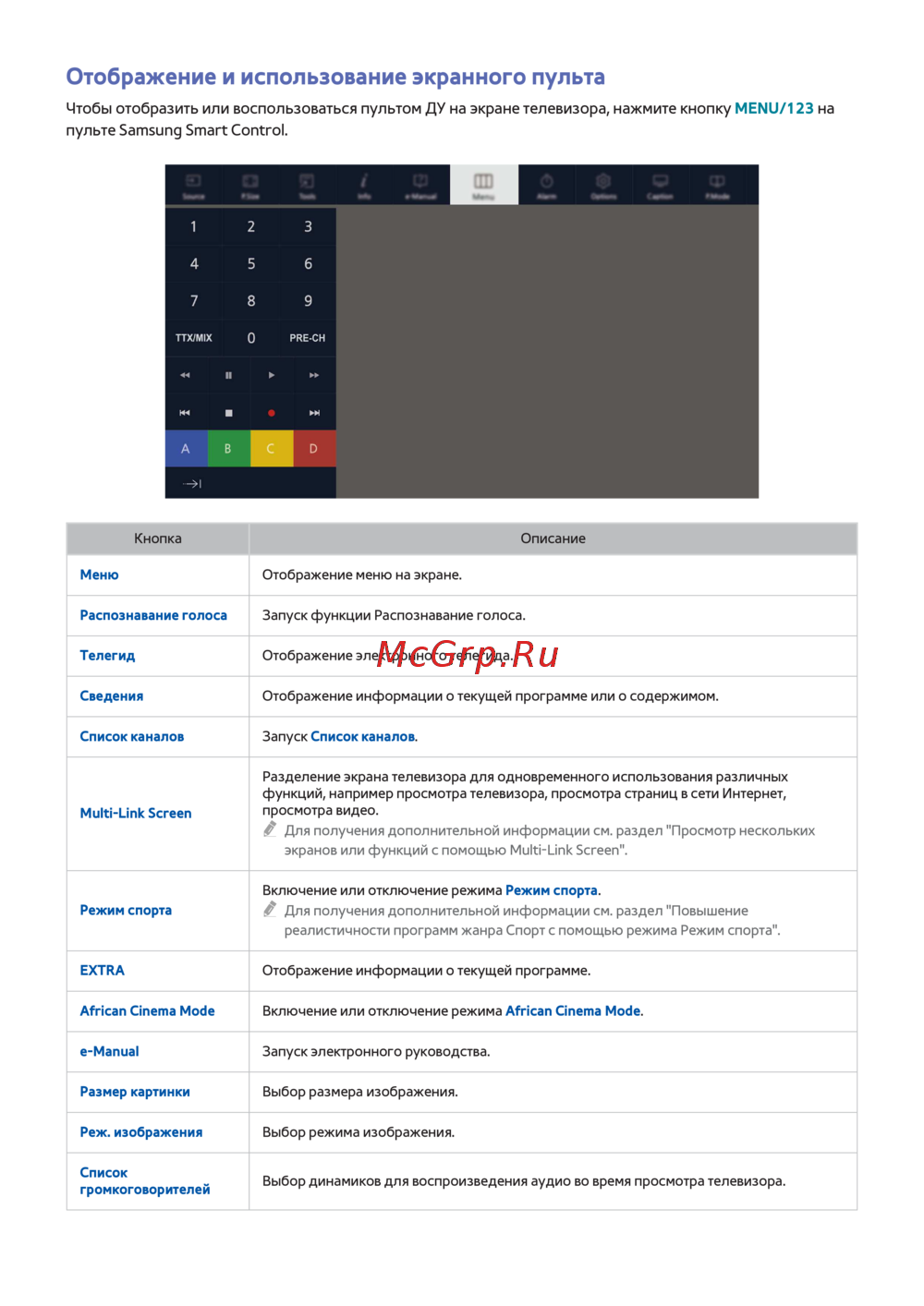 Чтобы отобразить или воспользоваться пультом ДУ на экране телевизора, нажмите кнопку MENU/123 на