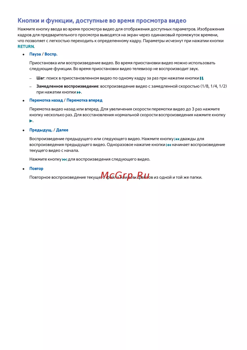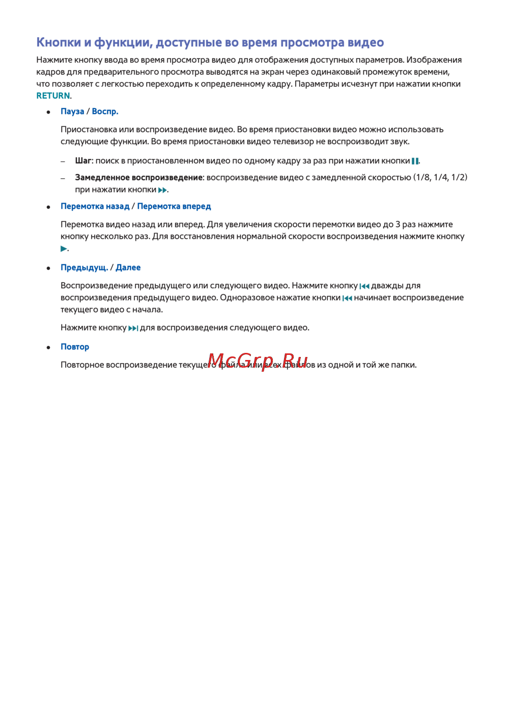 следующие функции. Во время приостановки видео телевизор не воспроизводит звук.