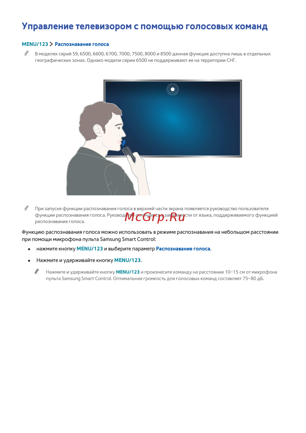 пульта Samsung Smart Control. Оптимальная громкость для голосовых команд составляет 75–80 дБ.