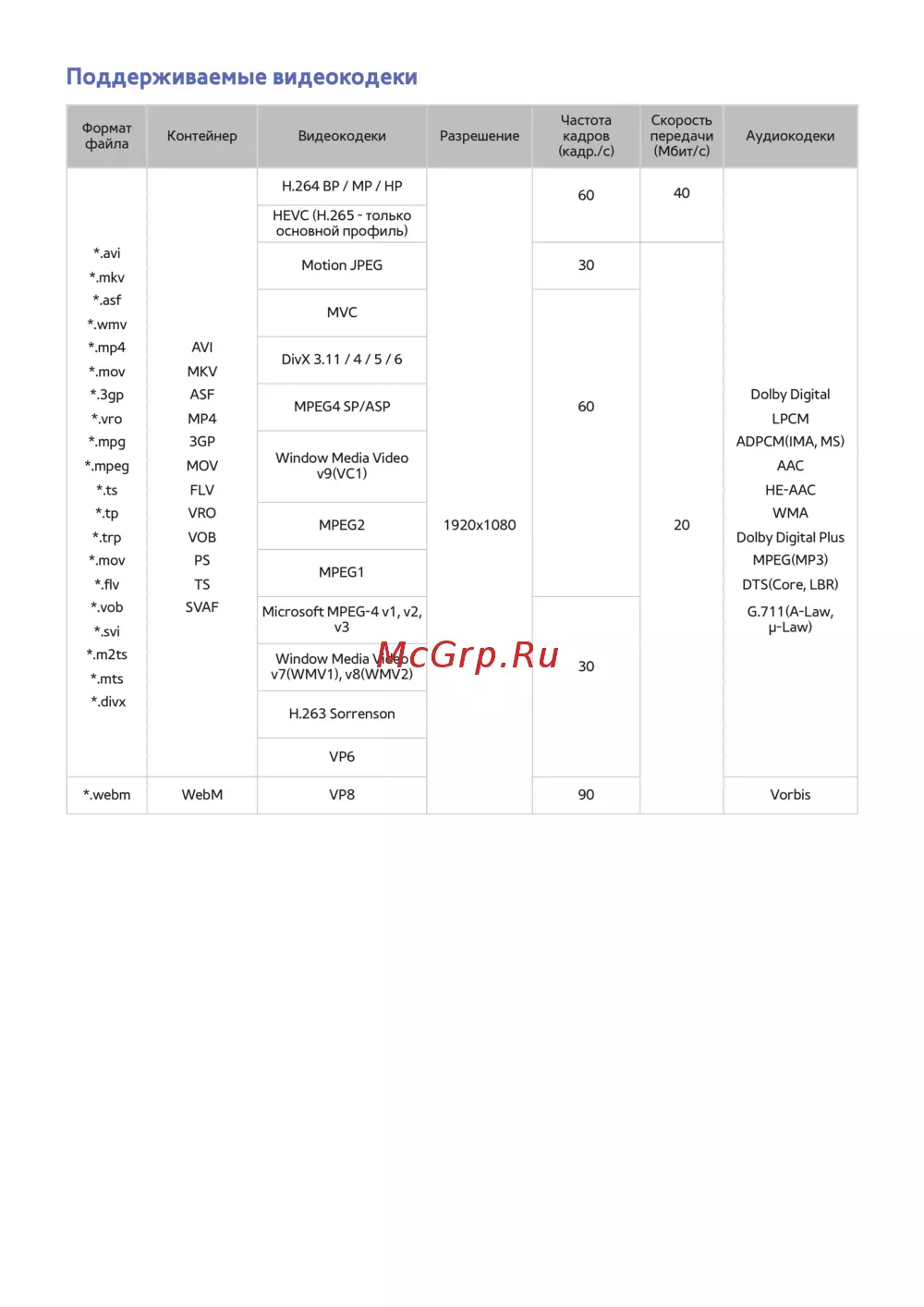 Samsung ue50j5500 [164/176] Поддерживаемые видеокодеки