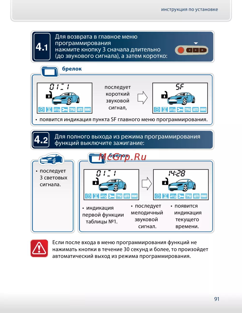 - Прозвучат 7 сигналов сирены подтверждающих вход в режим записи брелков радиоуправлени p.144