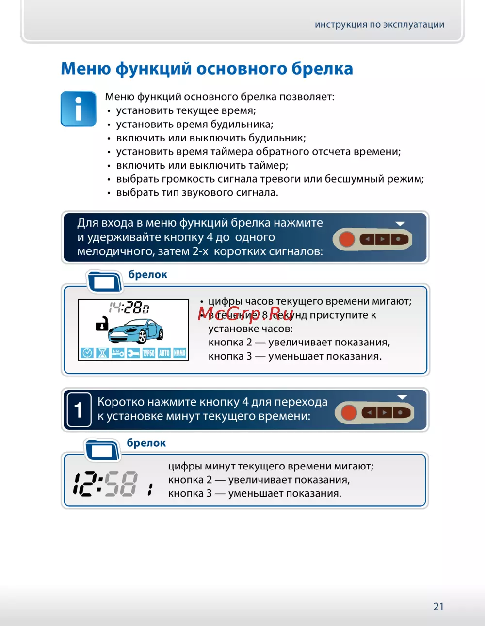 Узнайте, как использовать меню функций основного брелка для установки времени, будильника и таймера. Подробное руководство по настройкам и управлению.