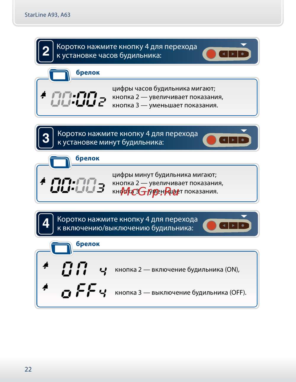 Starline a93 can-lin — настройка будильника на брелке: пошаговая инструкция [22/117]