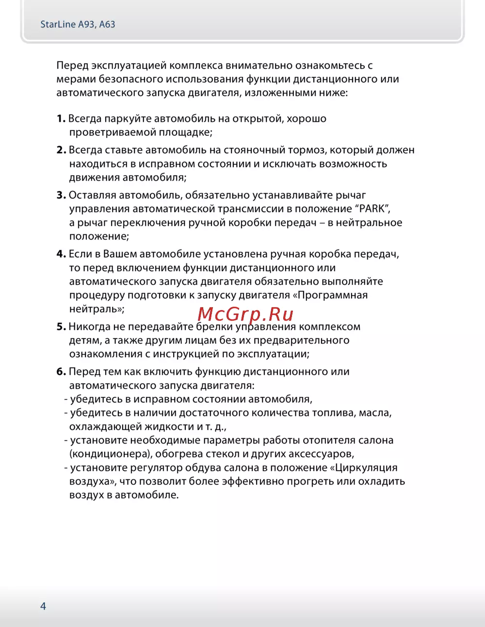Starline a93 can-lin — меры безопасности при использовании дистанционного запуска двигателя [4/117]