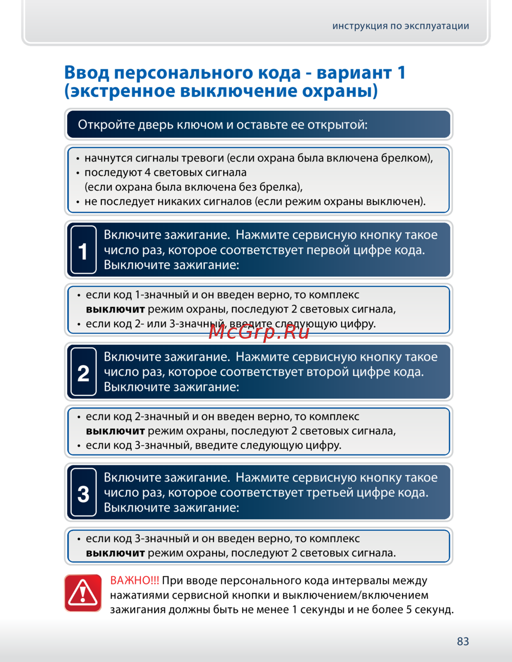 - В случае утери метки или её неработоспособности блокировку двигателя всегда можно отключить путем ввода персонального кода комплекса с помощью сервисной кнопки см стр 82 p.105