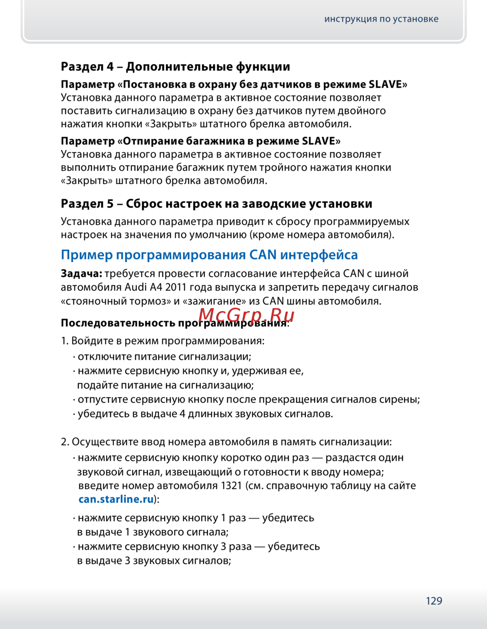 Starline a93 can-lin — инструкция по установке сигнализации и программированию функций [129/157]
