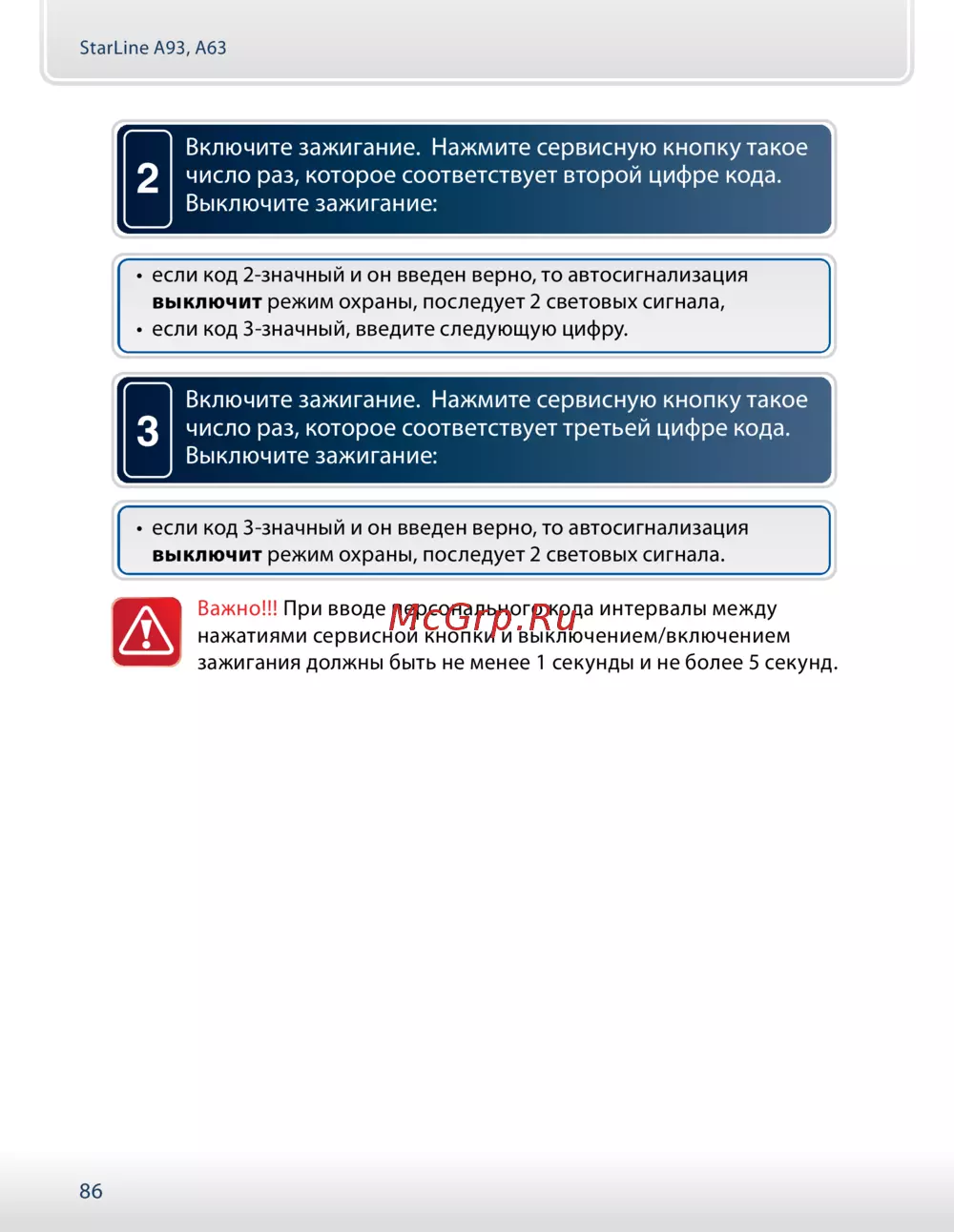 ![Starline a93 can-lin [86/118] Включите зажигание нажмите сервисную кнопку такое число раз которое соответствует третьей цифре кода выключите зажигание](/views2/1188447/page86/bg56.png)