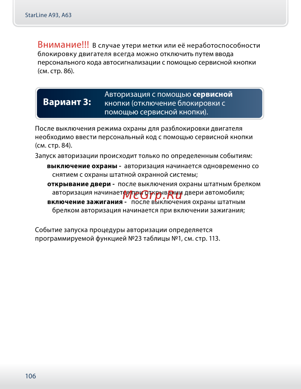 - В случае утери метки или её неработоспособности блокировку двигателя всегда можно отключить путем ввода персонального кода автосигнализации с помощью сервисной кнопки см стр 86 p.106