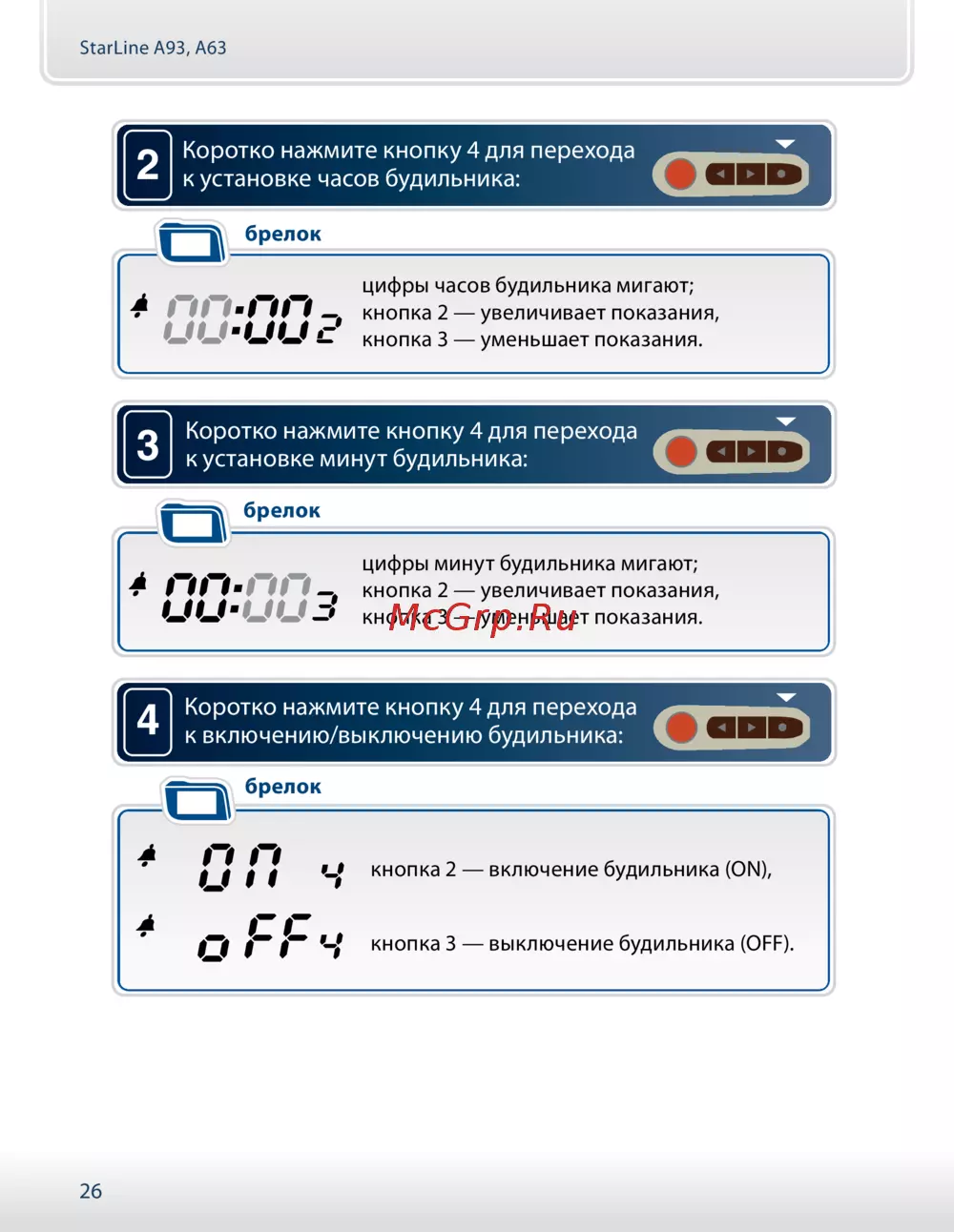 Starline a93 can-lin [26/118] Коротко нажмите кнопку 4 для перехода к включению выключению будильника
