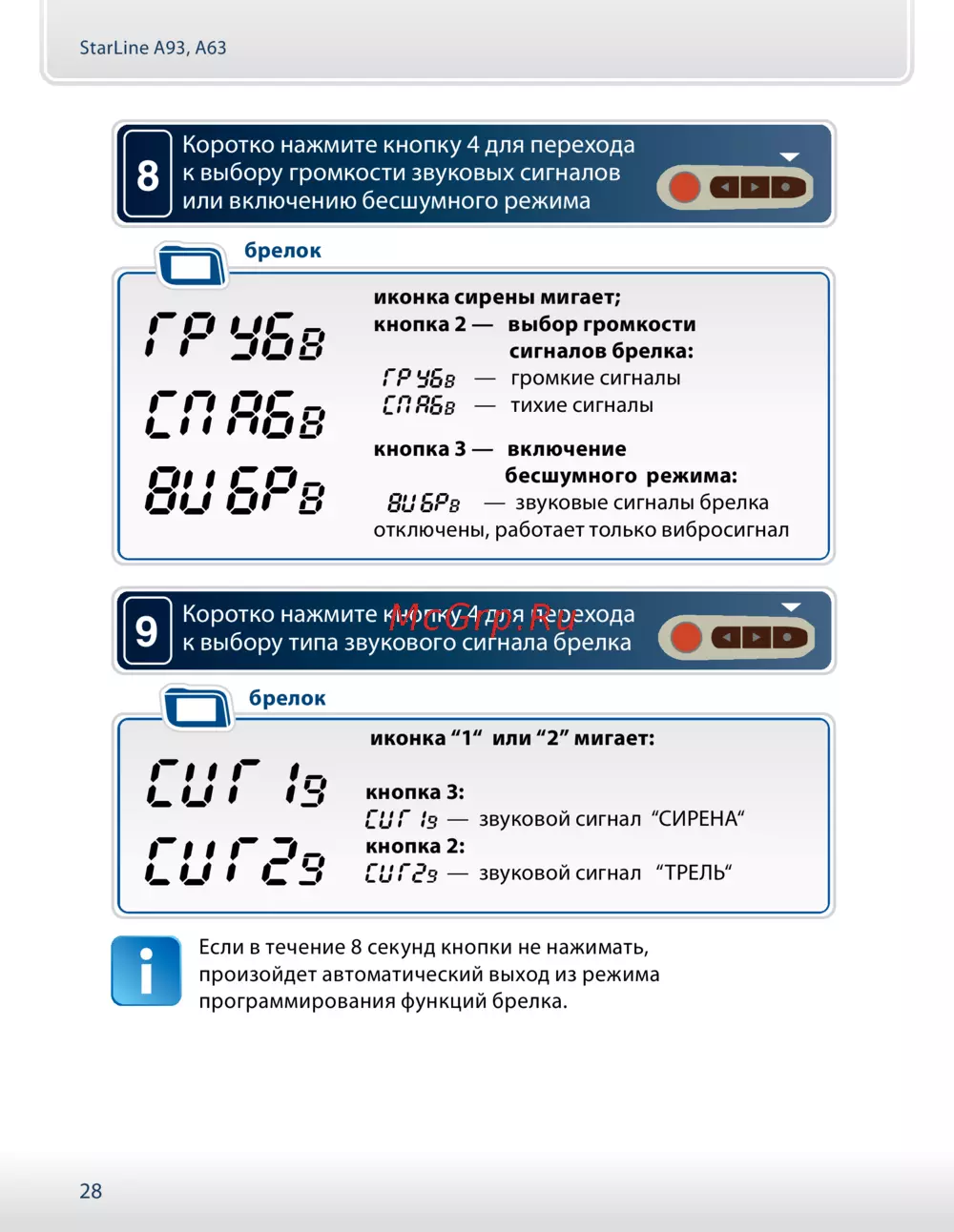 - Коротко нажмите кнопку 4 для перехода к выбору типа звукового сигнала брелка p.28