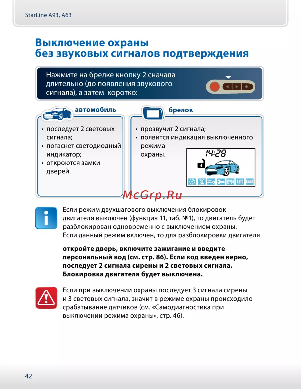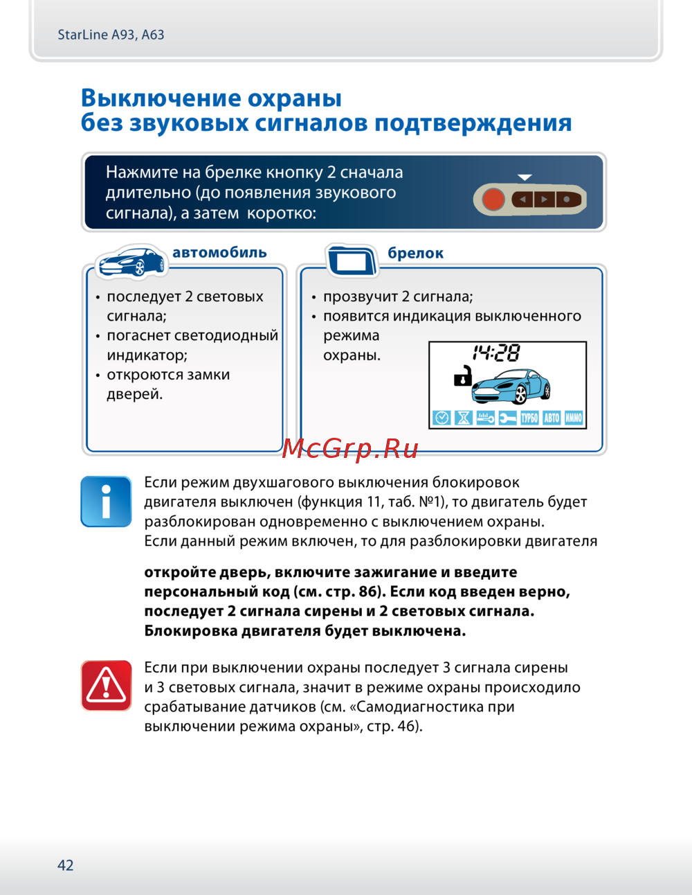 - Замки дверей откроются последуют световые и звуковые сигналы соответствующие выключению режима охраны светодиодный индикатор автосигнализации starline погаснет p.104