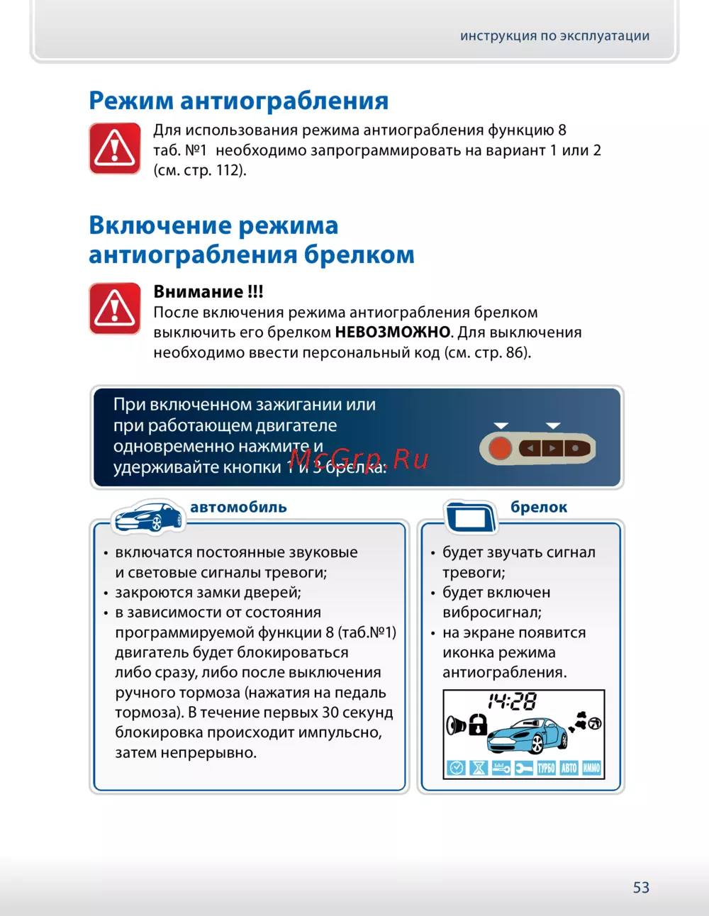 - Если режим антиограбления включен брелком отключить его можно только путем ввода персонального кода см стр 86 p.20