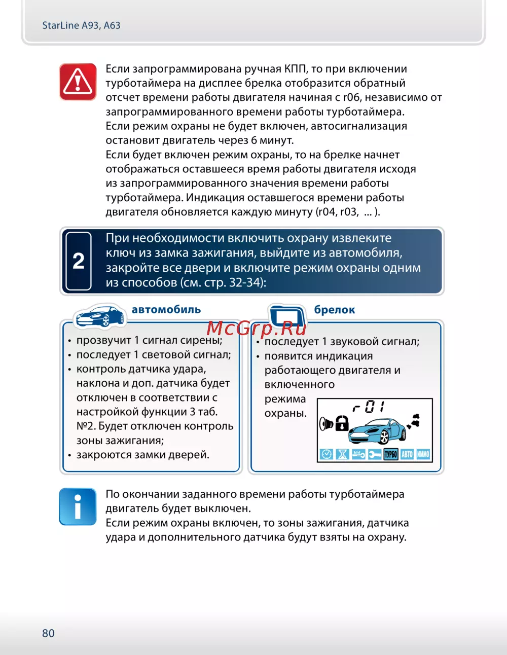![Starline A63 [80/118] При необходимости включить охрану извлеките ключ из замка зажигания выйдите из автомобиля закройте все двери и включите режим охраны одним из способов см стр 32 34](/views2/1178639/page80/bg50.png)