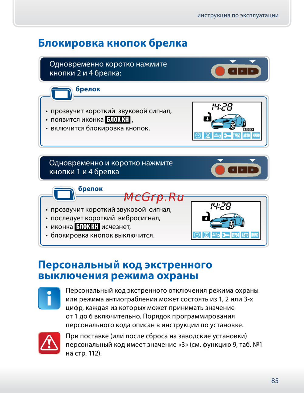 - Если режим антиограбления включен брелком отключить его можно только путем ввода персонального кода см стр 86 p.20