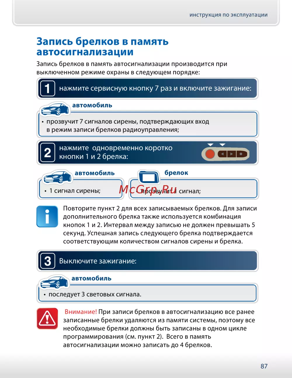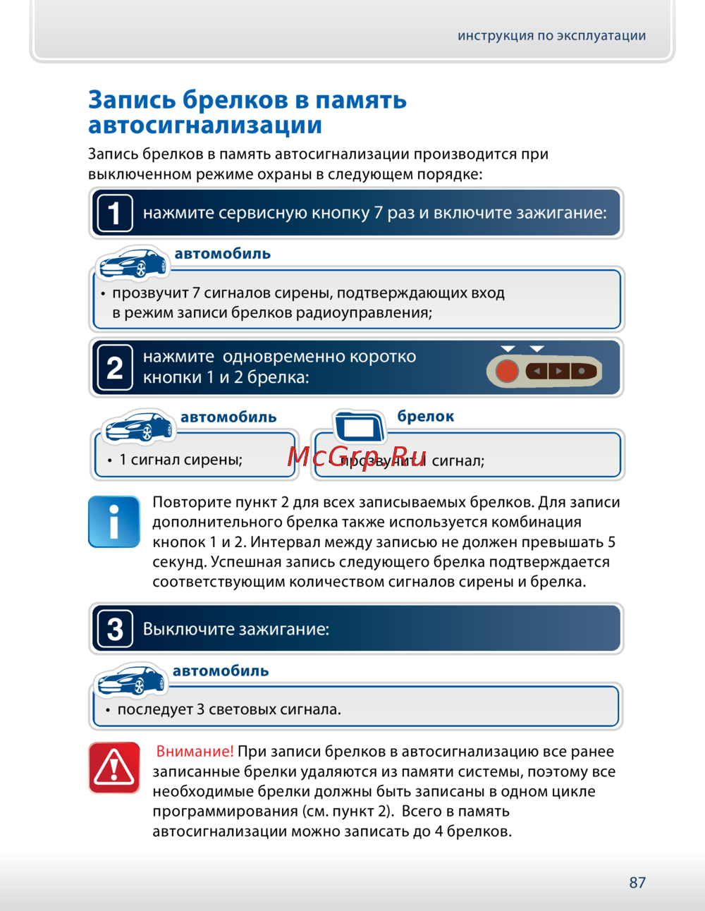 - Нажмите на брелке кнопку 1 сначала длительно до появления звукового сигнала затем коротко p.33