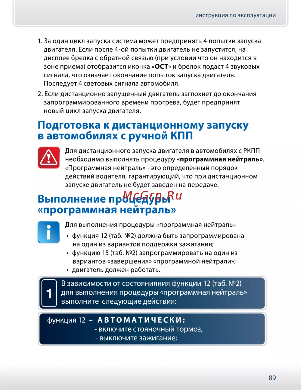 - Через несколько секунд произойдет автоматический запуск и прогрев двигателя время прогрева определяется программируемой функцией 2 см таб 2 на стр 114 заводская установка 10 минут p.97