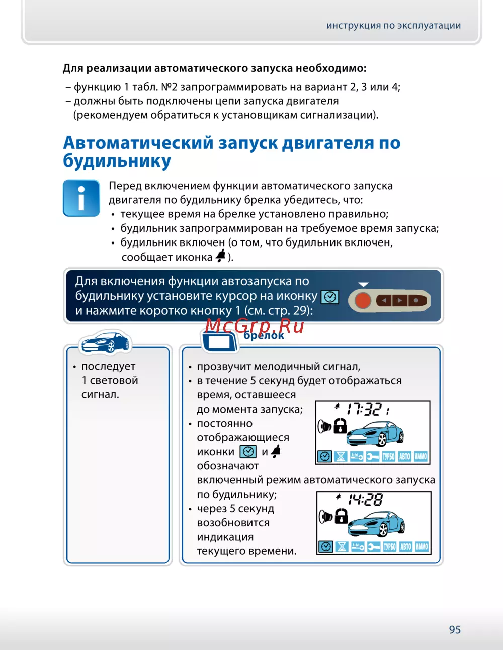 - Через несколько секунд произойдет автоматический запуск и прогрев двигателя время прогрева определяется программируемой функцией 2 см таб 2 на стр 114 заводская установка 10 минут p.97