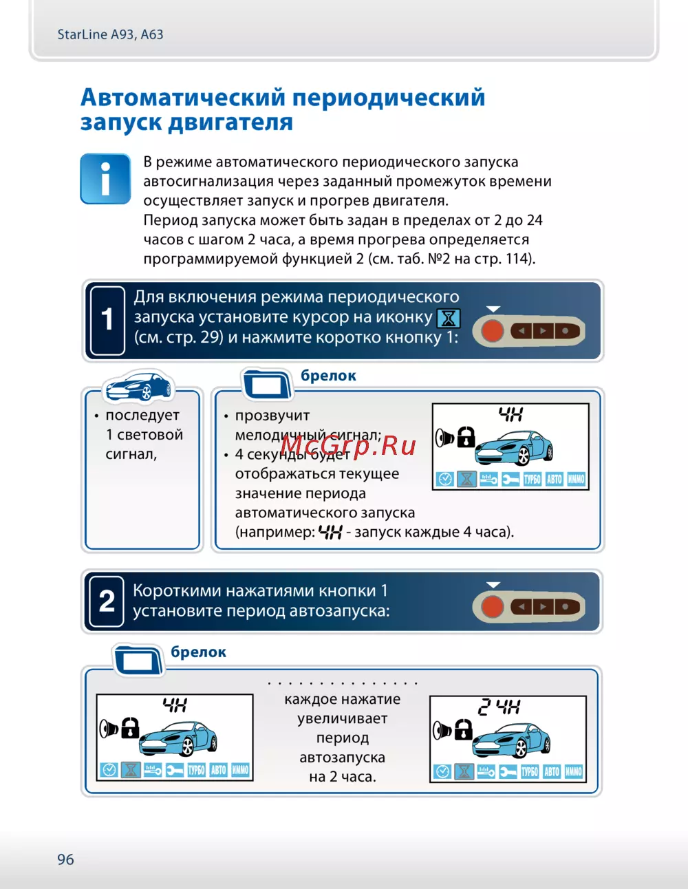 - Прозвучит 2 коротких сигнала начнет постоянно отображаться иконка обозначающая включенный режим периодического автозапуска p.97