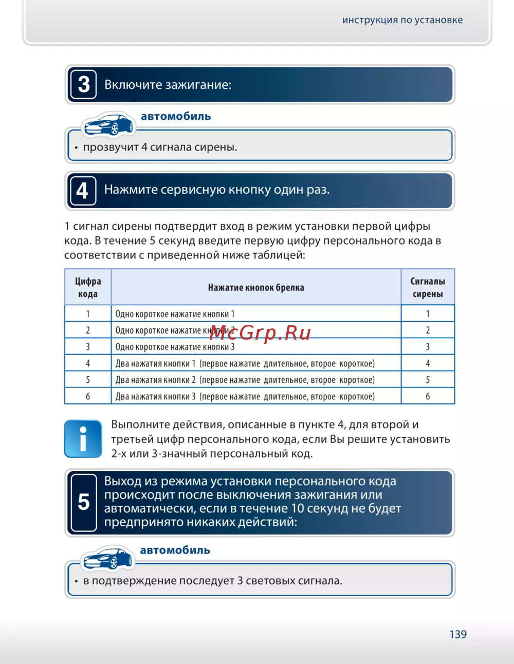 - Выход из режима установки персонального кода происходит после выключения зажигания или автоматически если в течение 10 секунд не будет предпринято никаких действий p.139
