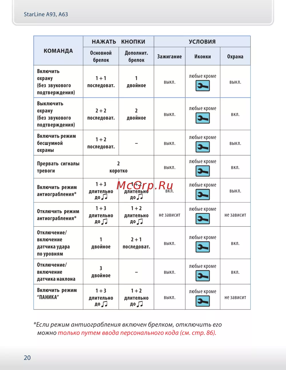 Starline a93 can-lin [20/118] Если режим антиограбления включен брелком отключить его можно только путем ввода персонального кода см стр 86