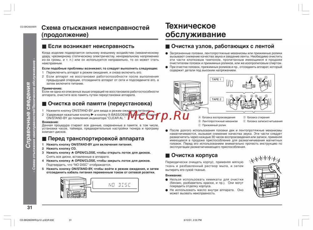 I При очистке головок, прижимных роликов и пр., отсоедиить аппарат, который