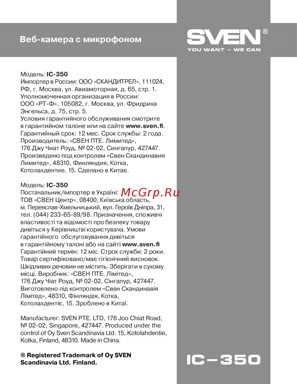 ![Sven ic-350 [13/13] Производитель свен пте лимитед 176 джу чиат роуд 02 02 сингапур 427447 произведено под контролем свен скандинавия лимитед 48310 финляндия котка котолахдентие 15 сделано в китае](/views2/1190634/page13/bgd.png)