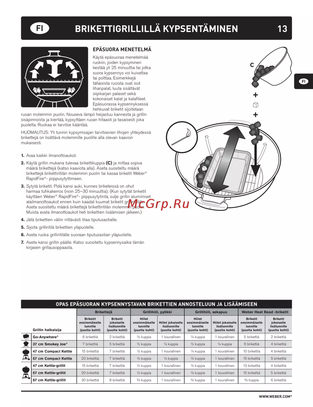 Opi käyttämään brikettejä oikein ja kypsentämään ruokaa epäsuoralla menetelmällä. Vinkkejä eri kokoisten grillien brikettimääriin ja kypsennysaikoihin.