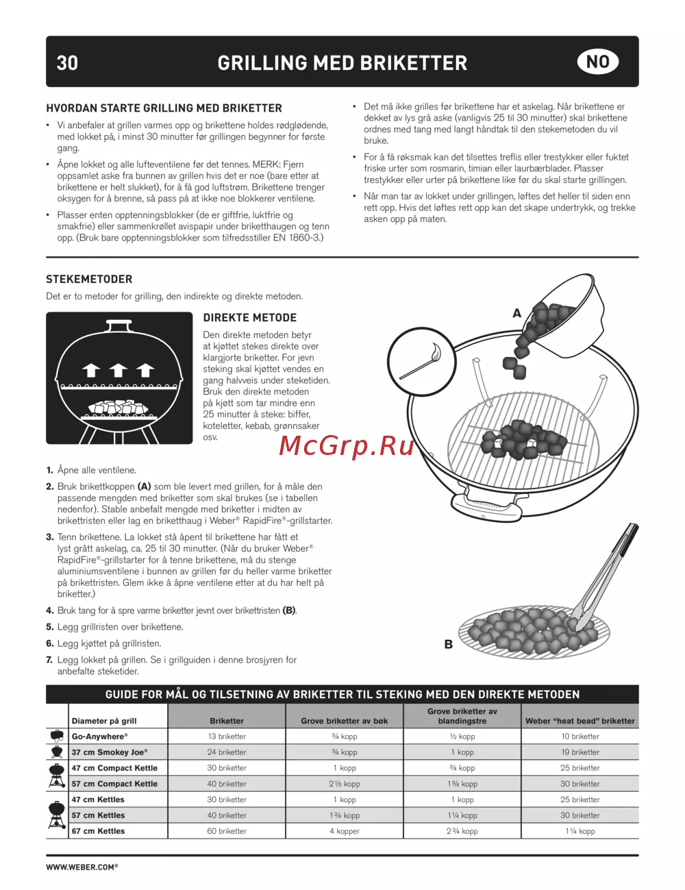 • Vi anbefaler at grillen varmes opp og brikettene holdes rødglødende,