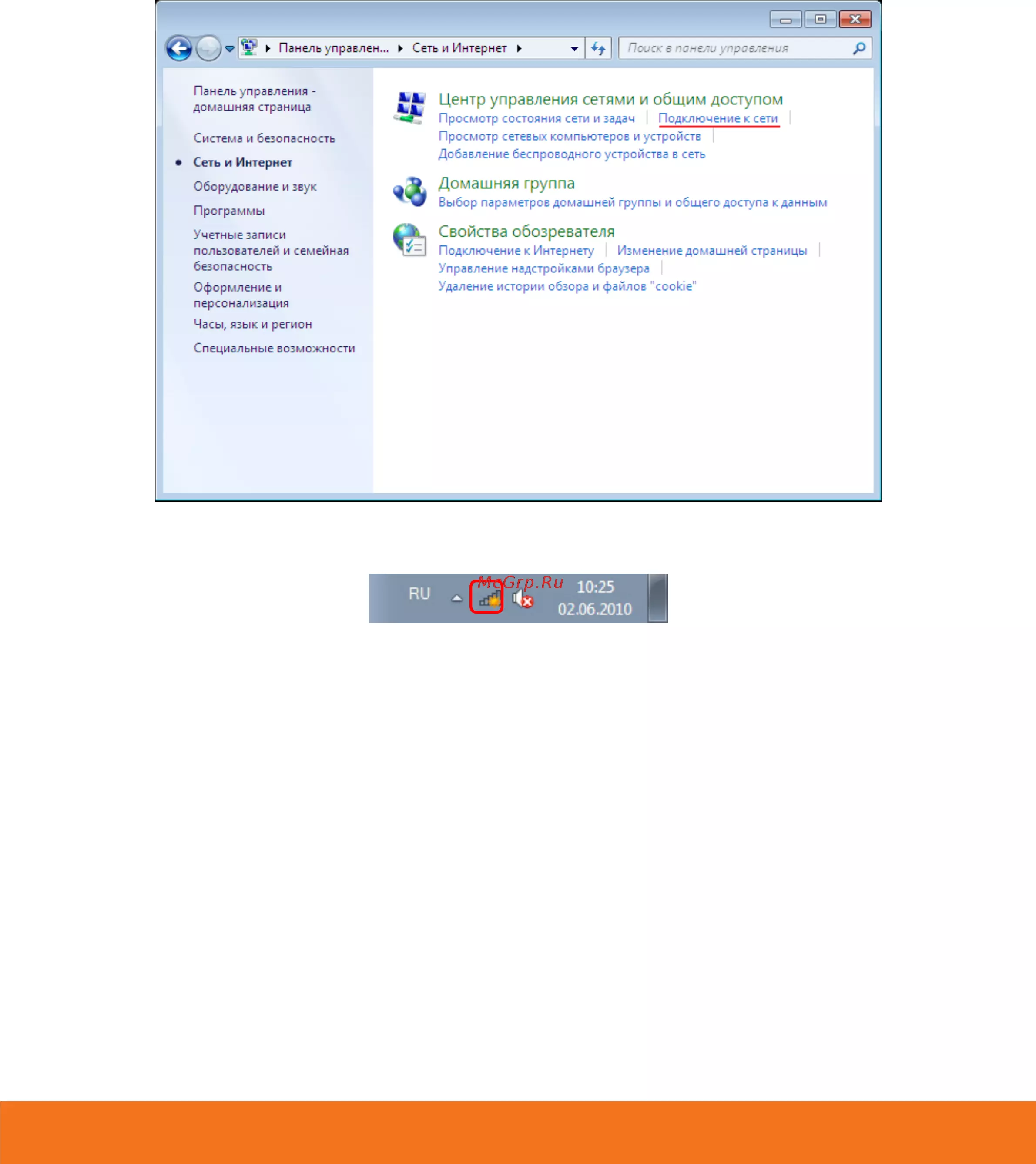 1. Пуск -> Панель управления -> Сеть и интернет -> Подключение к сети