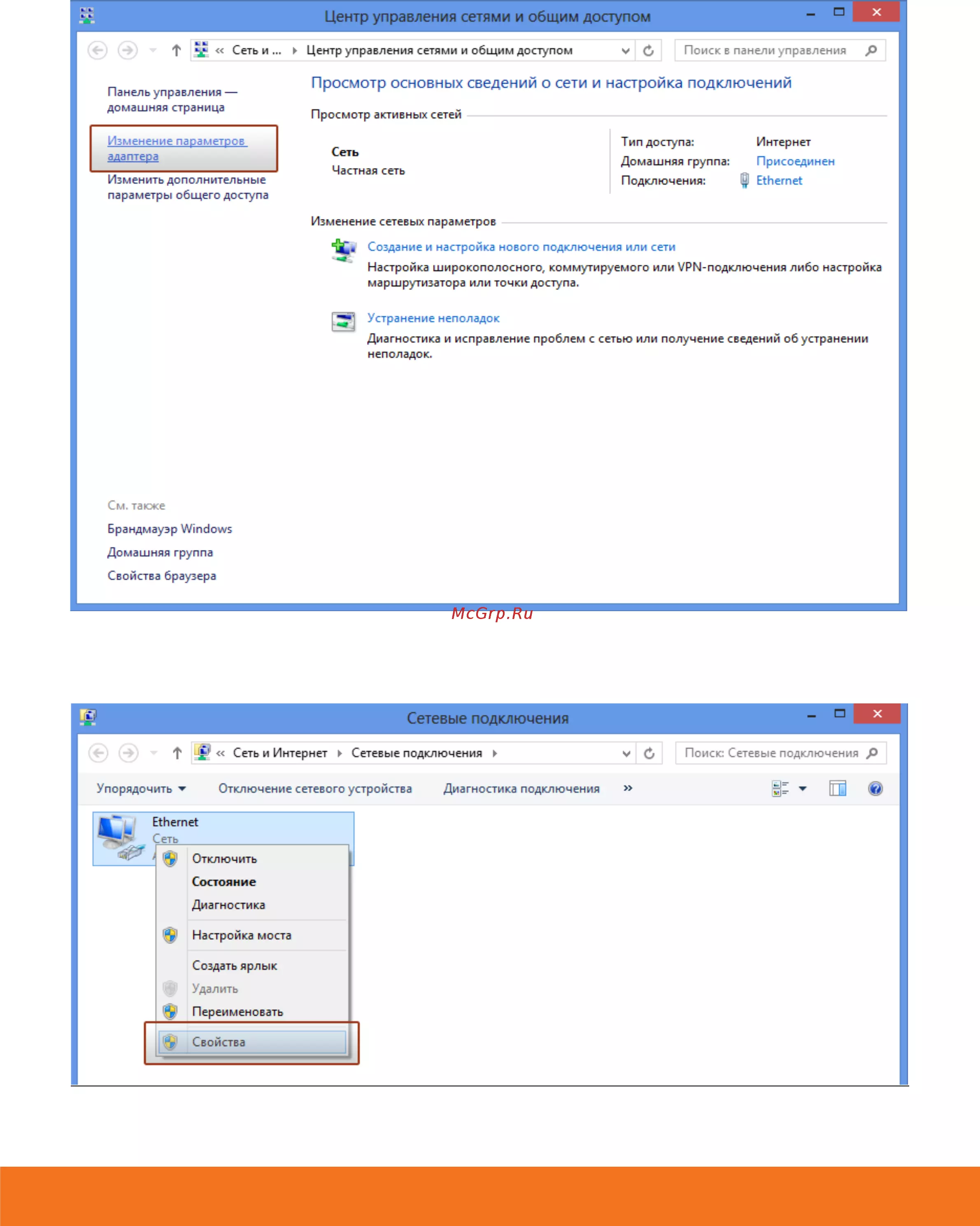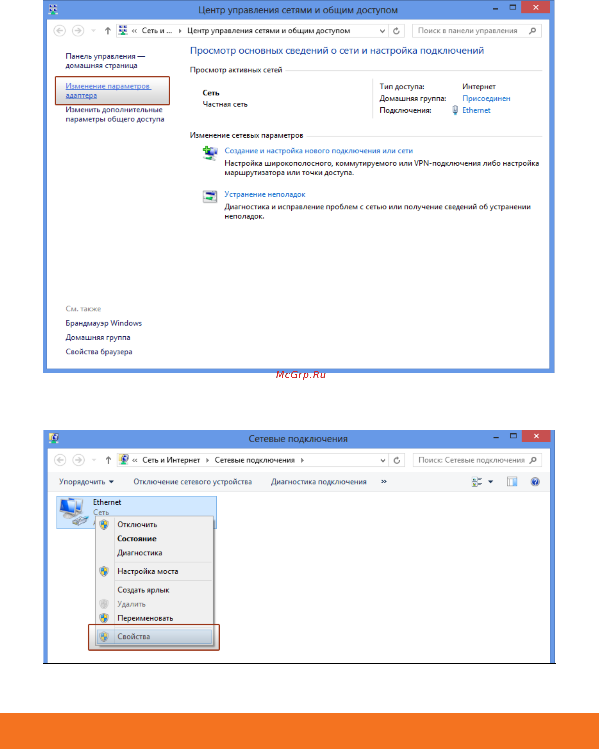 сетевых подключений, затем щёлкните левой кнопкой мыши на "Центр управления