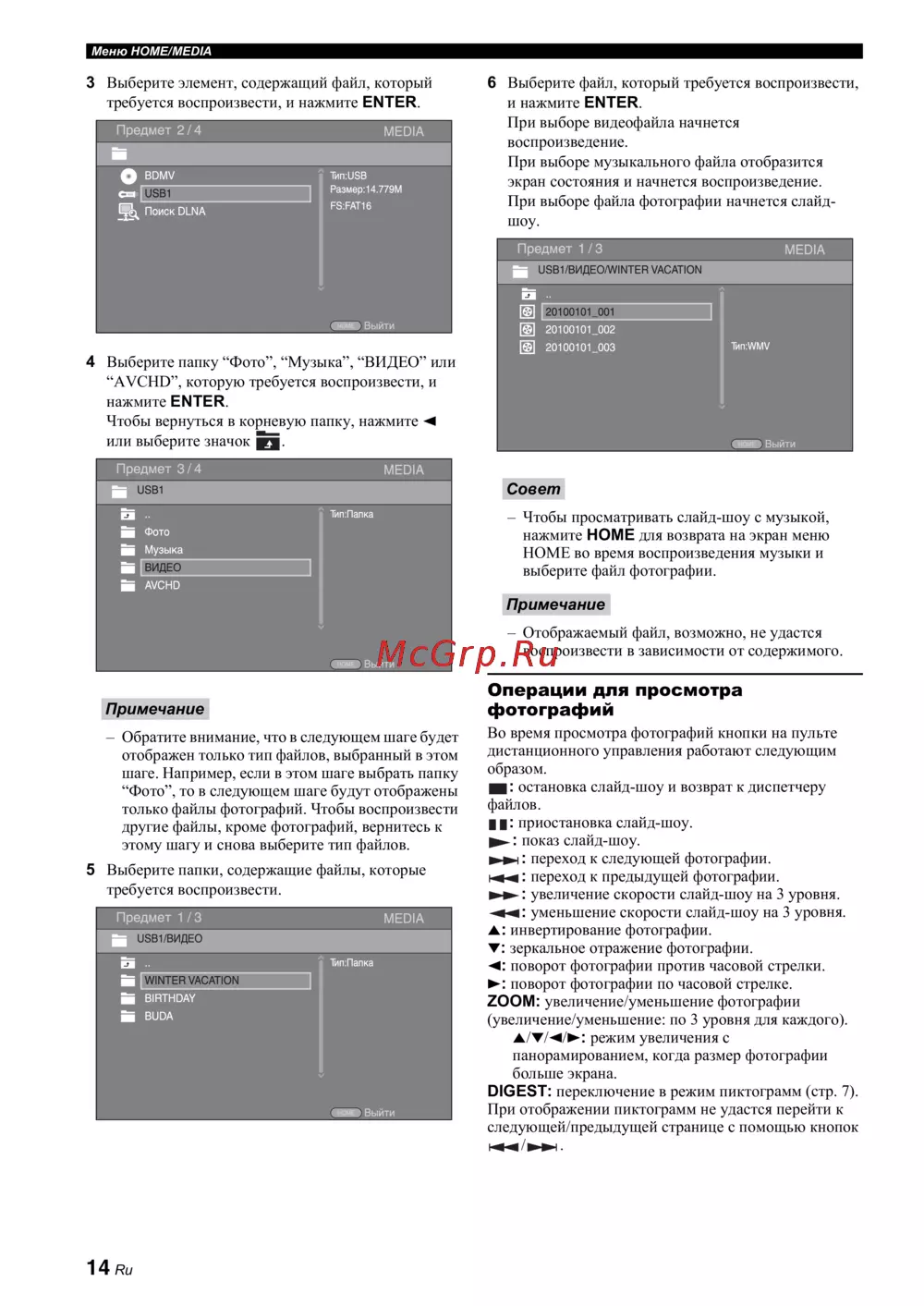Подробная инструкция по воспроизведению медиафайлов: выбор папок, запуск видео, музыки и фото. Управление слайд-шоу с пульта дистанционного управления.