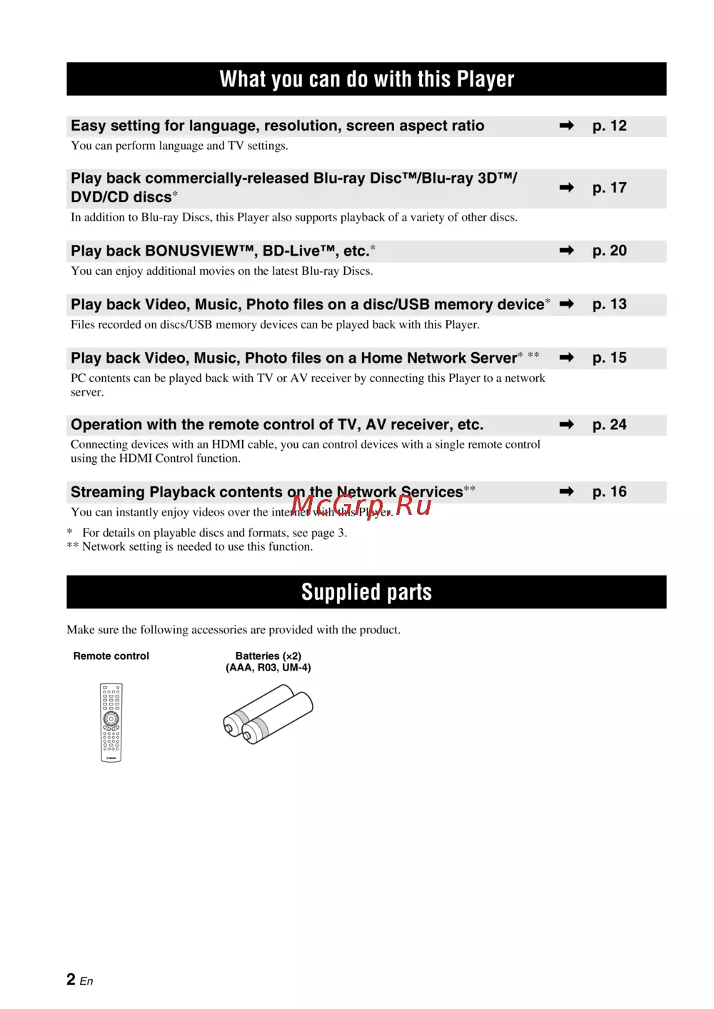 - Возможности этого проигрывателя 2 прилагаемые компоненты 2 о дисках и файлах 3 p.3