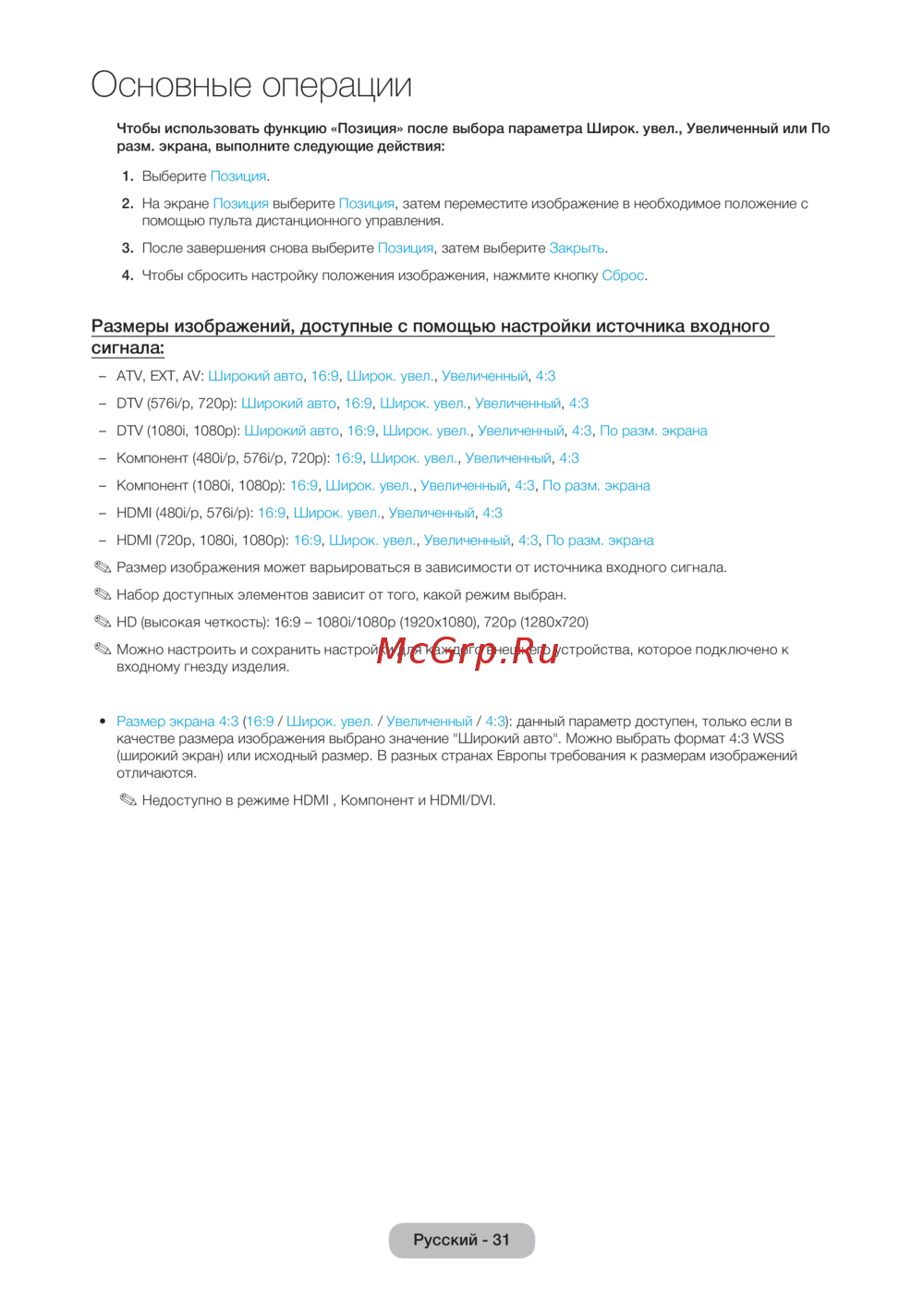 – DTV (1080i, 1080p): Широкий aвто, 16:9, Широк. увел., Увеличенный, 4:3, По разм. экрана