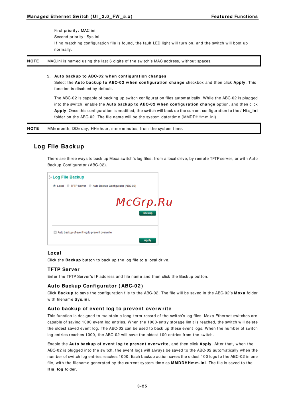 There are three ways to back up Moxa switch’s log files: from a local drive, by remote TFTP server, or with Auto