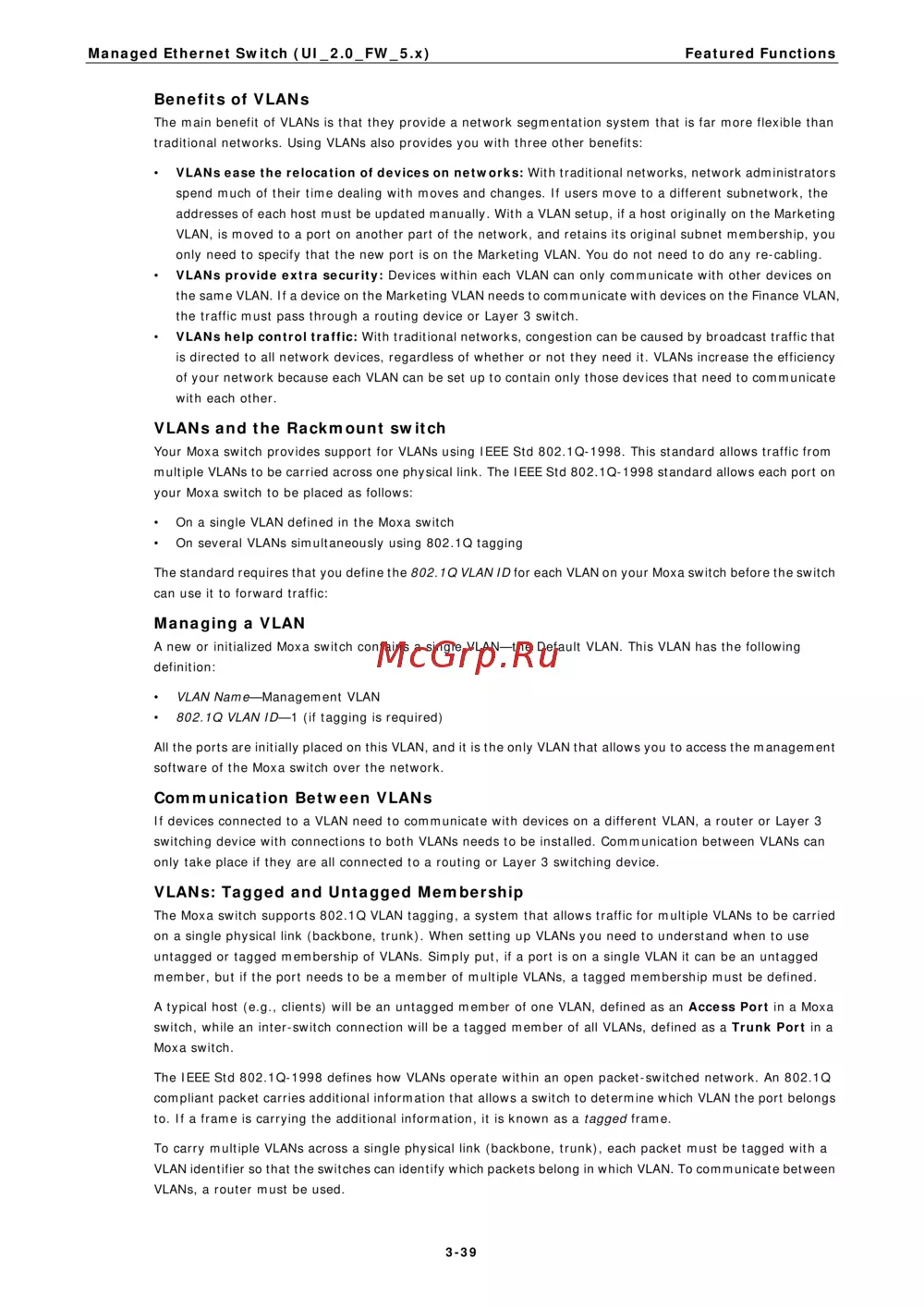 Your Moxa switch provides support for VLANs using IEEE Std 802.1Q-1998. This standard allows traffic from