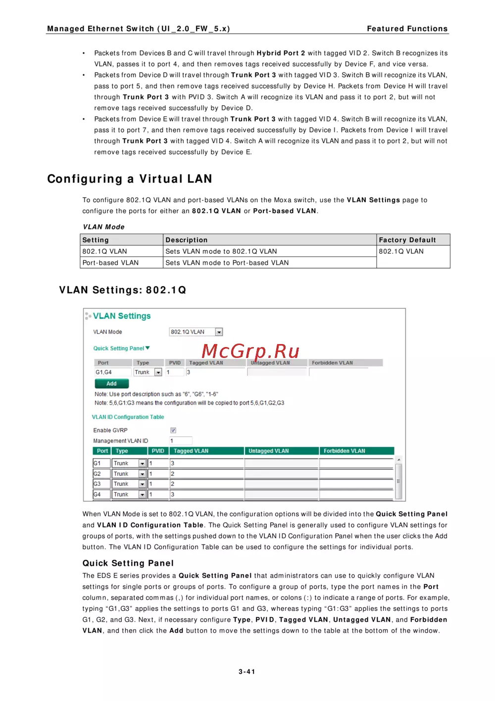 and VLAN ID Configuration Table. The Quick Setting Panel is generally used to configure VLAN settings for